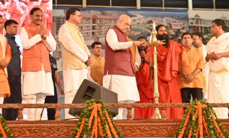 केन्द्रीय गृह एवं सहकारिता मंत्री अमित शाह एवं मुख्यमंत्री पुष्कर सिंह धामी ने पतंजलि योगपीठ में पतंजलि विवि के ₹300 करोड़ की लागत से निर्मित प्रशासनिक ब्लॉक का लोकार्पण किया तथा पतंजलि संन्यास आश्रम के 29वें सन्यास दिवस के द्वितीय संन्यास दीक्षा महोत्सव का शुभारम्भ किया। केन्द्रीय मंत्री ने कहा कि वे हर बार यहां से नई ऊर्जा और चेतना लेकर गए हैं। पतंजलि परिवार आने वाले दिनों में कई क्षेत्रों में देश के पुनरुद्धार और पुनर्निर्माण का काम करेगा। योग, आयुर्वेद और स्वदेशी के क्षेत्र में बाबा रामदेव ने विगत 25 सालों में अभूतपूर्व योगदान दिया है। उन्होंने कहा कि आचार्य बालकृष्ण आयुर्वेद के क्षेत्र में 500 से अधिक पेपर पब्लिश करने वाले दुनिया के 2% लोगों में से एक हैं। पतंजलि परिवार जैविक खेती को बढ़ावा देने के साथ ही सात्विक आहार के माध्यम से लाखों लोगों को निरामय जीवन जीने का रास्ता भी दिखाया है। मुख्यमंत्री श्री धामी ने कहा कि गृहमंत्री श्री अमित शाह जी की अगुवाई में देशहित में तमाम ऐसे साहसिक निर्णय हुए हैं, जिनसे भारत आंतरिक रूप से सशक्त हुआ है। इन सभी एतिहासिक कार्यों में उनकी विशेष भूमिका रही है। मुख्यमंत्री ने कहा कि प्रधानमंत्री श्री नरेंद्र मोदी जी के नेतृत्व में अभूतपूर्व रूप से भारत का सांस्कृतिक उत्थान हो रहा है। हमारी आस्था के केन्द्रों का इतिहास और महत्व उसी गौरव के साथ प्रदर्शित किया जा रहा है जिस प्रकार उसे किया जाना चाहिए था।