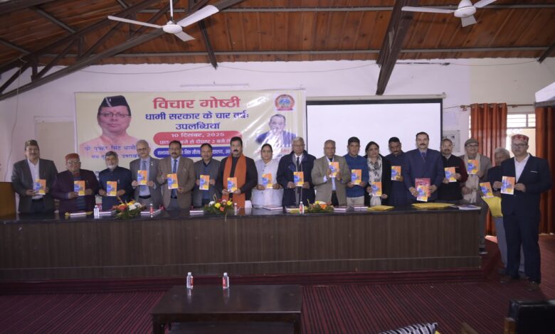 देहरादून 10 दिसंबर 2025: मुख्यमंत्री पुष्कर सिंह धामी के नेतृत्व में राज्य सरकार के चार वर्ष पूर्ण होने के उपलक्ष्य में बुधवार को सोबन सिंह जीना विश्वविद्यालय अल्मोड़ा में कुलपति सतपाल सिंह बिष्ट की अध्यक्षता में विचार गोष्ठी आयोजित की गई। इस गोष्ठी में विभिन्न क्षेत्रों के विषय-विशेषज्ञों, शिक्षाविदों, सामाजिक कार्यकर्ताओं, उद्यमियों, जनप्रतिनिधियों तथा बुद्धिजीवियों ने प्रतिभाग कर अपने विचार व्यक्त करते हुए मुख्यमंत्री श्री पुष्कर सिंह धामी के चार वर्ष से अधिक के कार्यकाल को राज्य हित में उनके द्वारा लिये गए निर्णयों को बेमिसाल बताया। इस कार्यक्रम में मुख्यमंत्री के मीडिया समन्वयक मदन मोहन सती द्वारा लिखित पुस्तक नायक से जननायक तथा धामी की धमक पुस्तिका का विमोचन भी किया गया।