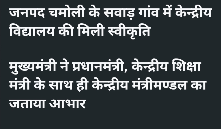मुख्यमंत्री ने कहा कि जनपद चमोली के प्रसिद्ध सवाड़ गांव में क्षेत्रीय जनता की मांग पर केन्द्रीय विद्यालय की स्थापना के लिये उनके द्वारा निरन्तर अनुरोध किया जा रहा था। उन्होंने कहा कि जनपद चमोली के सीमांत क्षेत्र में केन्द्रीय विद्यालय की स्थापना से इस क्षेत्र के छात्र-छात्राओं को बेहतर गुणात्मक शिक्षा उपलब्ध हो पायेगी तथा क्षेत्र को नई पहचान भी मिल सकेगी।