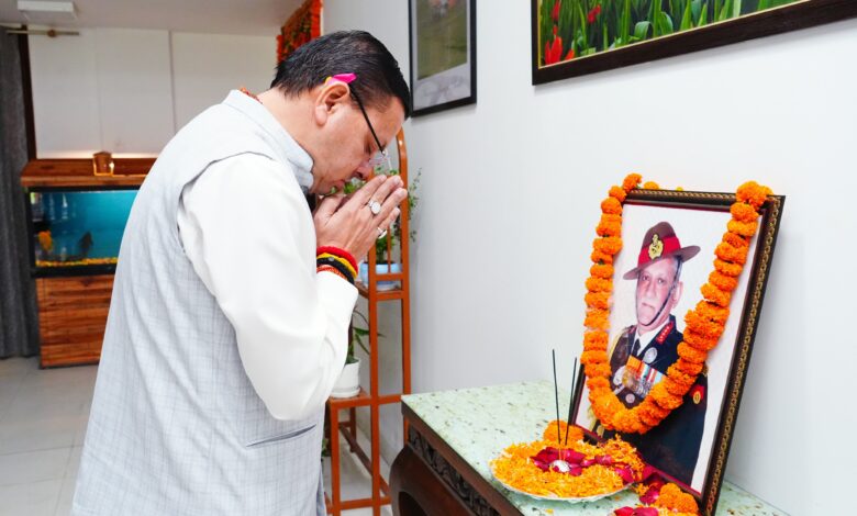 देहरादून 16 मार्च 2026 :मुख्यमंत्री पुष्कर सिंह धामी ने भारत के प्रथम चीफ ऑफ डिफेंस स्टाफ, पद्म विभूषण से अलंकृत तथा उत्तराखंड के गौरव, जनरल बिपिन रावत की जयंती पर मुख्यमंत्री आवास में उनके चित्र पर श्रद्धा सुमन अर्पित कर भावपूर्ण स्मरण किया।