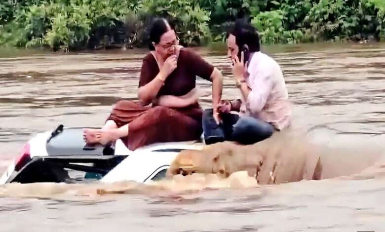 गुजरात। गुजरात के विभिन्न क्षेत्रों में लगातार हो रही बारिश के बीच, रविवार को साबरकांठा जिले में एक दंपत्ति अपने जलमग्न वाहन के ऊपर दो घंटे तक फंसे रहे, क्योंकि उनकी कार नदी के बहाव में बह गई थी। इस घटना ने ऑनलाइन काफ़ी ध्यान आकर्षित किया, ख़ास तौर पर इस दंपत्ति के शांत व्यवहार के कारण, जो विनाशकारी बाढ़ के बीच अपनी डूबी हुई कार की छत पर बैठे थे।