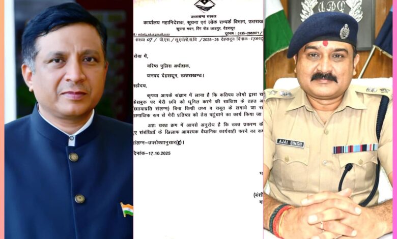 देहरादून 17 अक्टूबर 2025 । राज्य के महानिदेशक सूचना बंशीधर तिवारी ने सोशल मीडिया पर उनके खिलाफ चल रहे दुष्प्रचार और फेक पोस्ट्स के मामले में वरिष्ठ पुलिस अधीक्षक देहरादून अजय सिंह को पत्र लिखा है। उन्होंने अपनी छवि धूमिल करने की साजिश में शामिल व्यक्तियों के खिलाफ वैधानिक कार्रवाई की मांग की है।
