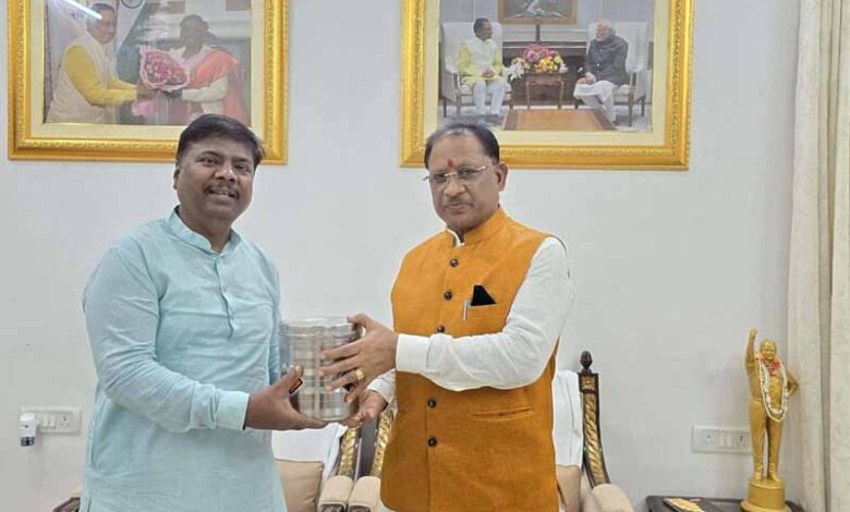 शारदीय नवरात्रि पर्व के पावन अवसर पर मुख्यमंत्री श्री विष्णु देव साय से वन एवं जलवायु परिवर्तन मंत्री श्री केदार कश्यप ने सौजन्य मुलाकात की और उन्हें नवरात्रि की शुभकामनाएं दीं। इस दौरान उन्होंने नारायणपुर जिले के अबूझमाड़ क्षेत्र के पहुंचविहीन कस्तुरमेटा गाँव के एक आदिवासी परिवार द्वारा घर में निर्मित शुद्ध देशी घी भेंट स्वरूप प्रदान किया। श्री कश्यप हाल ही में इस गांव के दौरे पर गए थे। यह गांव पहले माओवादी आतंक से प्रभावित रहा है।