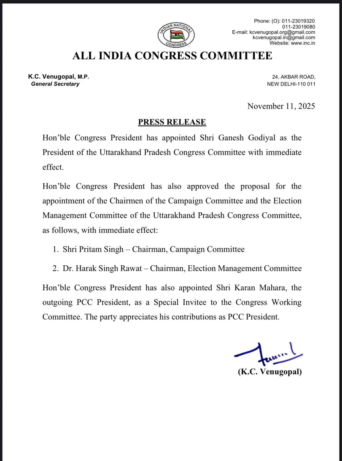 गणेश गोदियाल बने प्रदेश कांग्रेस अध्यक्ष, प्रीतम सिंह और हरक सिंह रावत को भी बड़ी जिम्मेदारी