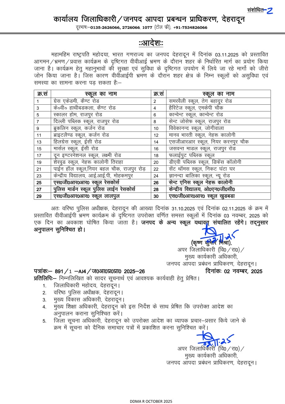 राष्ट्रपति द्रौपदी मुर्मू के देहरादून में कार्यक्रम के मद्देनज़र जनपद के 30 स्कूलों में अवकाश घोषित