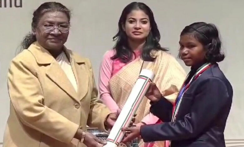 राष्ट्रपति भवन नई दिल्ली में आयोजित प्रधानमंत्री राष्ट्रीय बाल पुरस्कार 2024 से राष्ट्रीय जुडो खिलाड़ी, कोंडागांव की बिटिया हेमबती नाग को आज राष्ट्रपति श्रीमती द्रौपदी मुर्मु द्वारा प्रधानमंत्री राष्ट्रीय बाल पुरस्कार 2024 से सम्मानित किया गया।