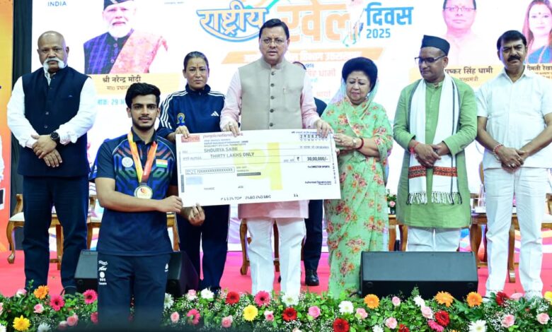 शुक्रवार को मेजर ध्यानचंद जयंती के अवसर पर बहुउद्देश्यी क्रीड़ा हाल परेड ग्राउंड में आयोजित राष्ट्रीय खेल दिवस – 2025, समारोह को संबोधित करते हुए, मुख्यमंत्री श्री पुष्कर सिंह धामी ने कहा कि खेल और खेल भावना समाज को ऊर्जा, अनुशासन और प्रेरणा प्रदान करती है। उन्होंने कहा कि मेजर ध्यानचंद ने अपनी स्टिक के जादू से पूरी दुनिया को भारत की खेल शक्ति से परिचित कराया। उन्होंने हिटलर तक को ये बता दिया कि देश भक्ति आखिर क्या होती है। उन्हीं के आदर्शों पर चलकर आज प्रधानमंत्री नरेंद्र मोदी के नेतृत्व में हमारा देश भी एक वैश्विक खेल शक्ति बन रहा है, इसमें उत्तराखंड भी अपनी भूमिका निभाने के लिए कमर कस चुका है। उन्होंने कहा कि प्रधानमंत्री “खेलो इंडिया” और “फिट इंडिया मूवमेंट” जैसे कार्यक्रमों के माध्यम से देश में खेल संस्कृति को प्रोत्साहित करने का प्रयास कर रहे हैं। आज हमारे खिलाड़ी केवल किसी प्रतियोगिता में भाग लेने के लिए ही नहीं खेलते बल्कि जीतने और तिरंगा लहराने के संकल्प के साथ मैदान में उतरते हैं। हाल के वर्षों के उदाहरण देखें तो जहां, 2020 के टोक्यो ओलंपिक में भाला फेंक में नीरज चोपड़ा ने स्वर्ण पदक जीतकर इतिहास रचा वहीं पुरुष हॉकी टीम ने 41 वर्षों बाद कांस्य पदक हासिल किया। इसी तरह पेरिस ओलंपिक में नीरज चोपड़ा ने रजत पदक, मनु भाकर ने दो कांस्य पदक, स्वप्निल कुसले व अमन सेहरावत ने एक- एक कांस्य पदक जीतकर और पुरुष हॉकी टीम ने लगातार अपना दूसरा कांस्य पदक जीतकर भारत का गौरव बढ़ाया। हाल ही में हुई एशियाई एथलेटिक्स चैम्पियनशिप में ज्योति याराज्जी, गुलवीर सिंह और अविनाश सबले ने स्वर्ण पदक जीतकर भारत का परचम बुलंद किया है। प्रधानमंत्री नरेंद्र मोदी ने खेल बजट तीन गुना बढ़ा दिया है।