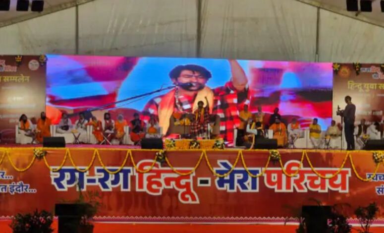 इन्दौर. स्थानीय लालबाग परिसर में आयोजित हिंदू युवा सम्मेलन में बागेश्वर धाम के पीठाधीश्वर युवा संत धीरेंद्र शास्त्री ने युवाओं को संबोधित करते हुए हुंकार भरी कि जिसे भारत से प्यार नहीं उसे इस देश में रहने का अधिकार नहीं। उन्होंने उपस्थित जन समूह का आव्हान करते हुए चेतावनी देते कहा कि अकेले रहोगे तो कश्मीरी हिंदुओं की तरह भागना पड़ेगा। एक रहोगे तो धर्म विरोधियों को देश छोड़कर भागना पड़ेगा। पंडित धीरेंद्र शास्त्री ने हिंदू युवा सम्मेलन में रग-रग हिंदू मेरा परिचय विषय पर लोगों को संबोधित करते कहा कि हम मुसलमानों के खिलाफ नहीं है। हम केवल हिंदू- हिंदू करते हैं। हम केवल हिंदुओं के पक्ष में हैं।