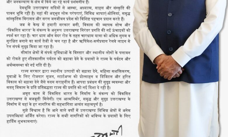 प्रधानमंत्री ने प्रदेश के सीमांत क्षेत्रों में कनेक्टिविटी बढ़ाने और शीतकालीन पर्यटन को प्रोत्साहित करने के प्रयासों को भी सराहा। उन्होंने कहा कि इन पहलों से न केवल पर्यटन को बढ़ावा मिला है, बल्कि पलायन रोकने और स्थानीय अर्थव्यवस्था को सशक्त बनाने में भी मदद मिली है। अपने संदेश में प्रधानमंत्री ने राज्य सरकार द्वारा स्थानीय उत्पादों के प्रोत्साहन, महिला सशक्तिकरण, युवाओं के लिए रोजगार सृजन, स्टार्टअप्स को बढ़ावा तथा डिजिटल और हरित विकास जैसे प्रयासों को सराहनीय बताया। साथ ही, आपदा प्रबंधन की सुदृढ़ व्यवस्था और सतत विकास के प्रति प्रतिबद्धता को राज्य की प्रगति के लिए महत्वपूर्ण बताया।