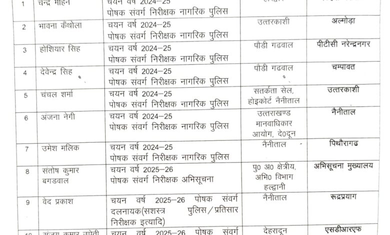 उत्तराखण्ड शासन के आदेश दिनांक 02-03-2026 द्वारा निरीक्षक (नागरिक पुलिस), (अभिसूचना) एवं दलनायक ( सशस्त्र पुलिस/प्रतिसार निरीक्षक इत्यादि) से उत्तराखण्ड पुलिस सेवा संवर्ग के ‘‘ पुलिस उपाधीक्षक, कनिष्ठ वेतनमान’’ के प्रोन्नति कोटा के रिक्त पदों पर पदोन्नति के आधार पर *पुलिस मुख्यालय द्वारा निम्नलिखित निरीक्षक(नागरिक पुलिस), (अभिसूचना) एवं दलनायक (सशस्त्र पुलिस/प्रतिसार निरीक्षक इत्यादि) को ‘‘पुलिस उपाधीक्षक, कनिष्ठ वेतनमान लेवल-10) के पदों पर कार्यभार ग्रहण करने की तिथि से पदोन्नति प्रदान* किये जाने के आदेश पारित किये गये है।