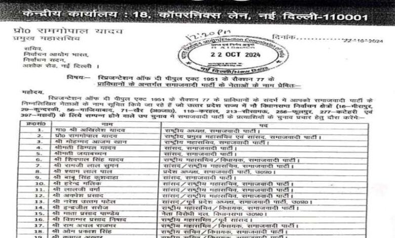 सपा ने वरिष्ठ नेता अवधेश प्रसाद, राज्यसभा सांसद जया बच्चन, और लालजी वर्मा को भी स्टार प्रचारक का दर्जा दिया है. इसके अलावा राम अचल राजभर भी प्रमुख प्रचारक के रूप में नजर आएंगे. ये सभी नेता अपने-अपने क्षेत्रों में सपा का प्रचार करेंगे और पार्टी के प्रत्याशियों के पक्ष में मतदाताओं को आकर्षित करेंगे. सपा की इस स्टार प्रचारक सूची के जारी होने के बाद उपचुनाव में प्रचार का माहौल और भी गर्म होने की संभावना है. मालूम हो कि उपचुनाव के लिए 9 सीटों पर 13 नवंबर को वोटिंग होगी जबकि 23 नवंबर को इसके नतीजे घोषित किए जाएंगे.